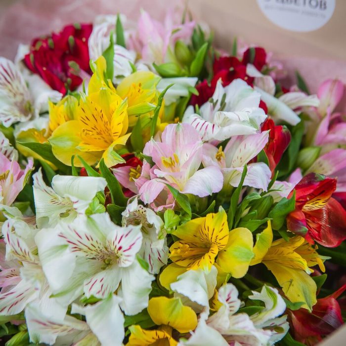 Альстромерия белая – 5 шт.Альстромерия розовая – 5 шт.Альстромерия красная – 5 шт.Упаковка крафт – 1 шт.Атласная лента – 1 шт.