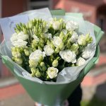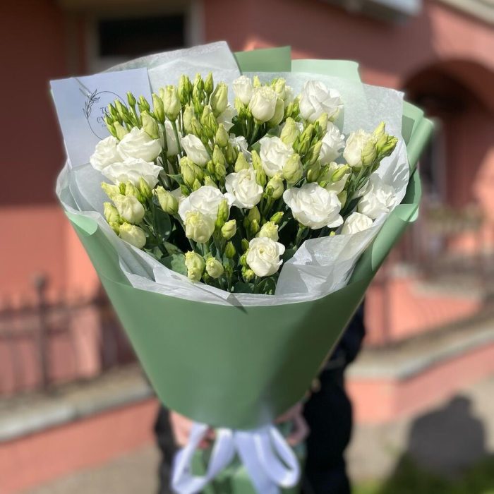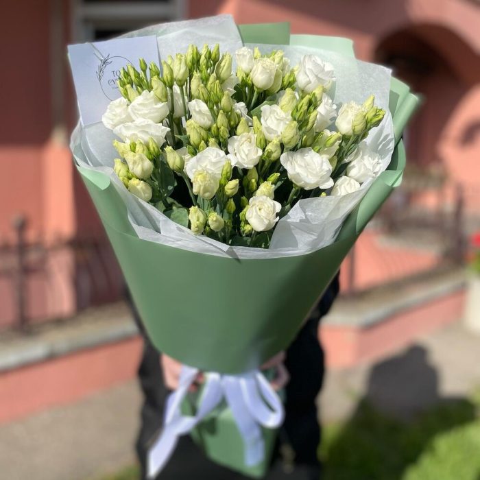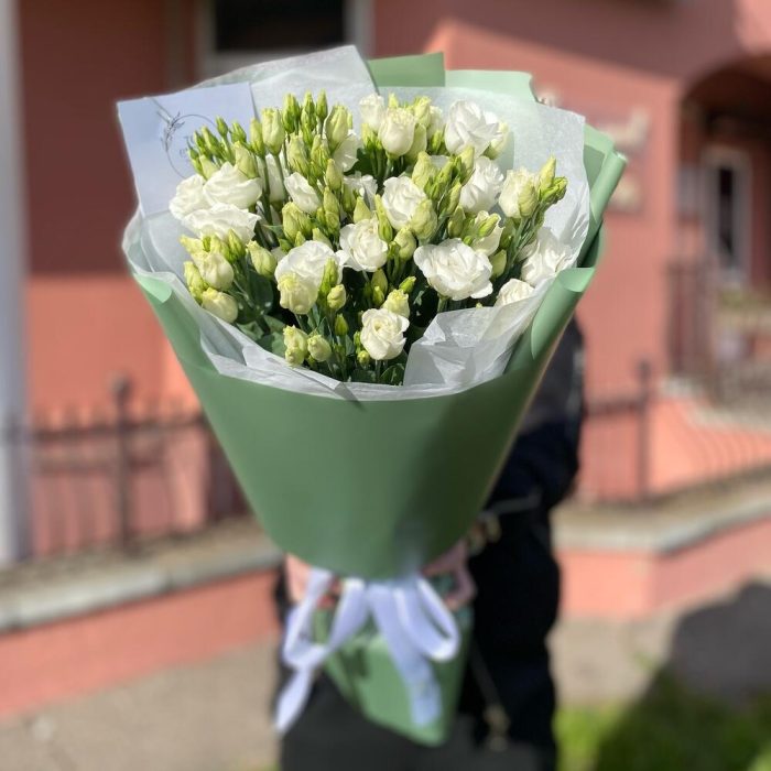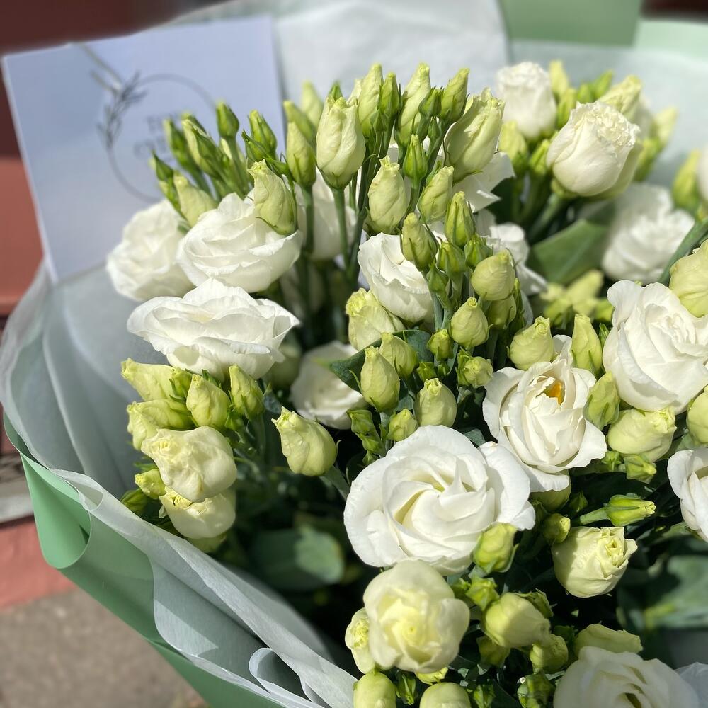 Букет из 9 веток белой эустомы в дизайнерском оформлении.