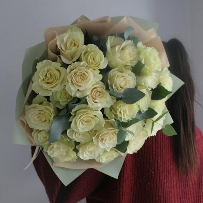 Эвкалипт – 5 шт.Дизайнерская упаковка – 2 шт.mondial роза одноголовая 60 см – 25 шт.