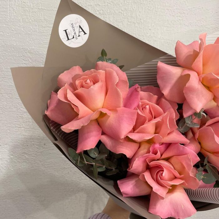 Эвкалипт – 3 шт.Лента атласная – 2 шт.Упаковка дизайнерская – 2 шт.Эквадор роза – 5 шт.