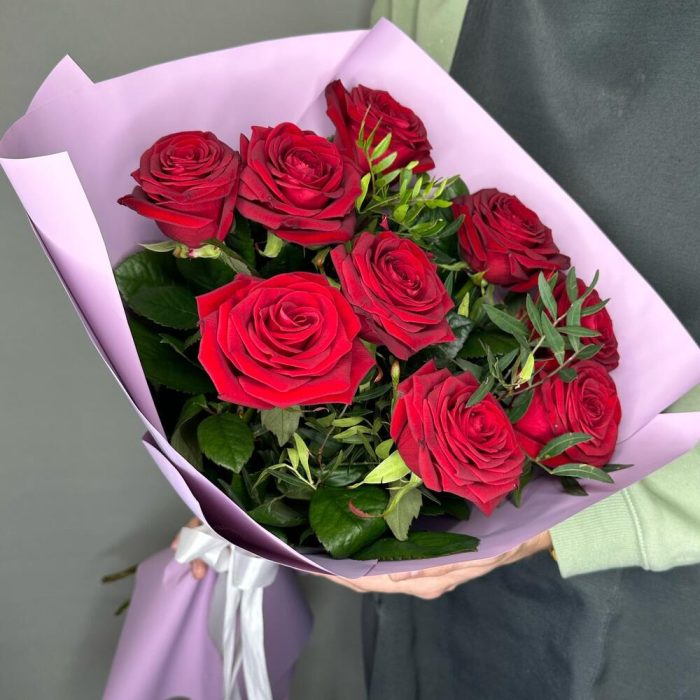 Букет из красных роз с зеленью