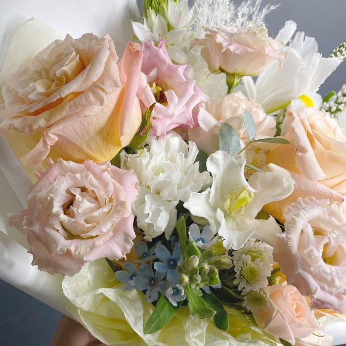 Вероника – 2 шт.Ирис – 2 шт.Лизиантус – 1 шт.Роза кремовая – 3 шт.Роза кустовая – 1 шт.Хризантема кустовая – 1 шт.Гвоздика – 2 шт.Орнитогалум – 1 шт.Оксипеталум – 2 шт.Упаковка дизайнерская – 1 шт.Тюльпан белый – 2 шт.