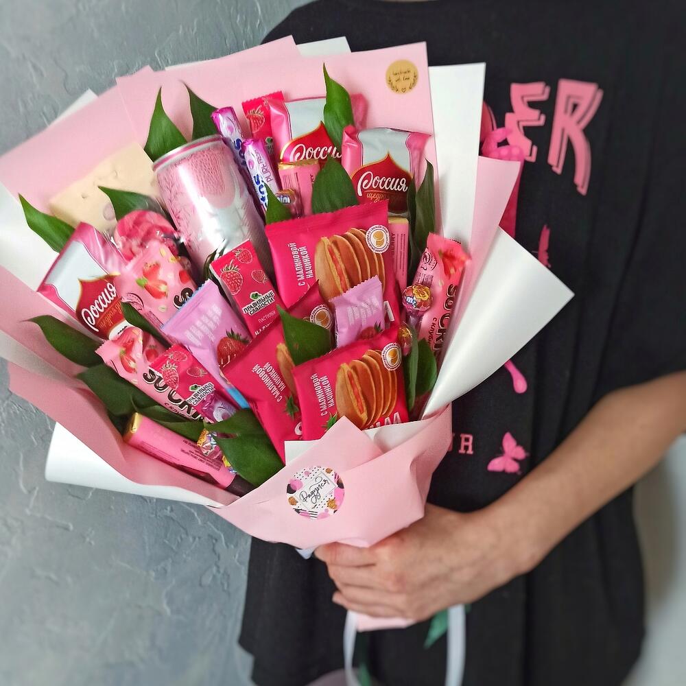 “Сладкое сердце ” – цветочная композиция с сладостями в коробке “Сердце”