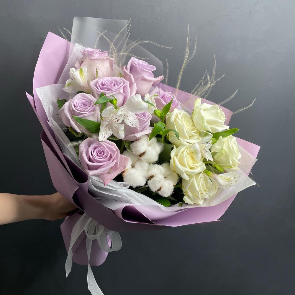 Альстромерия – 2 шт.Хлопок – 3 шт.Роза белая – 5 шт.Роза сиреневая – 7 шт.Упаковка дизайнерская – 1 шт.стифа пучок – 4 шт.